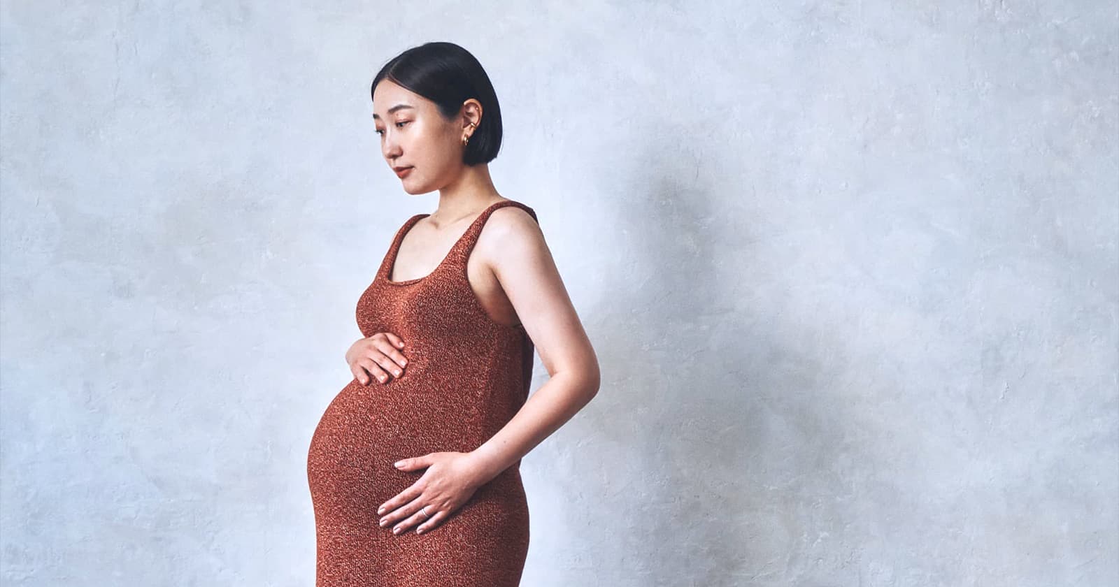 お腹の丸みに沿うストレッチ素材の服は、自然な美しいシルエットを作ってくれます。